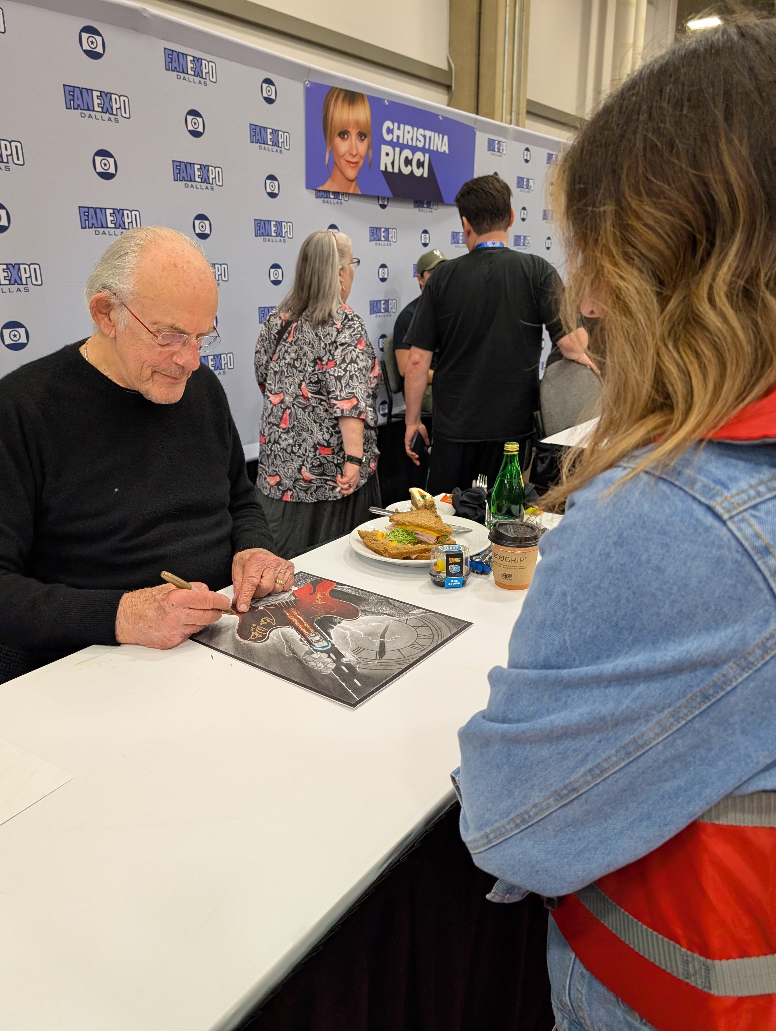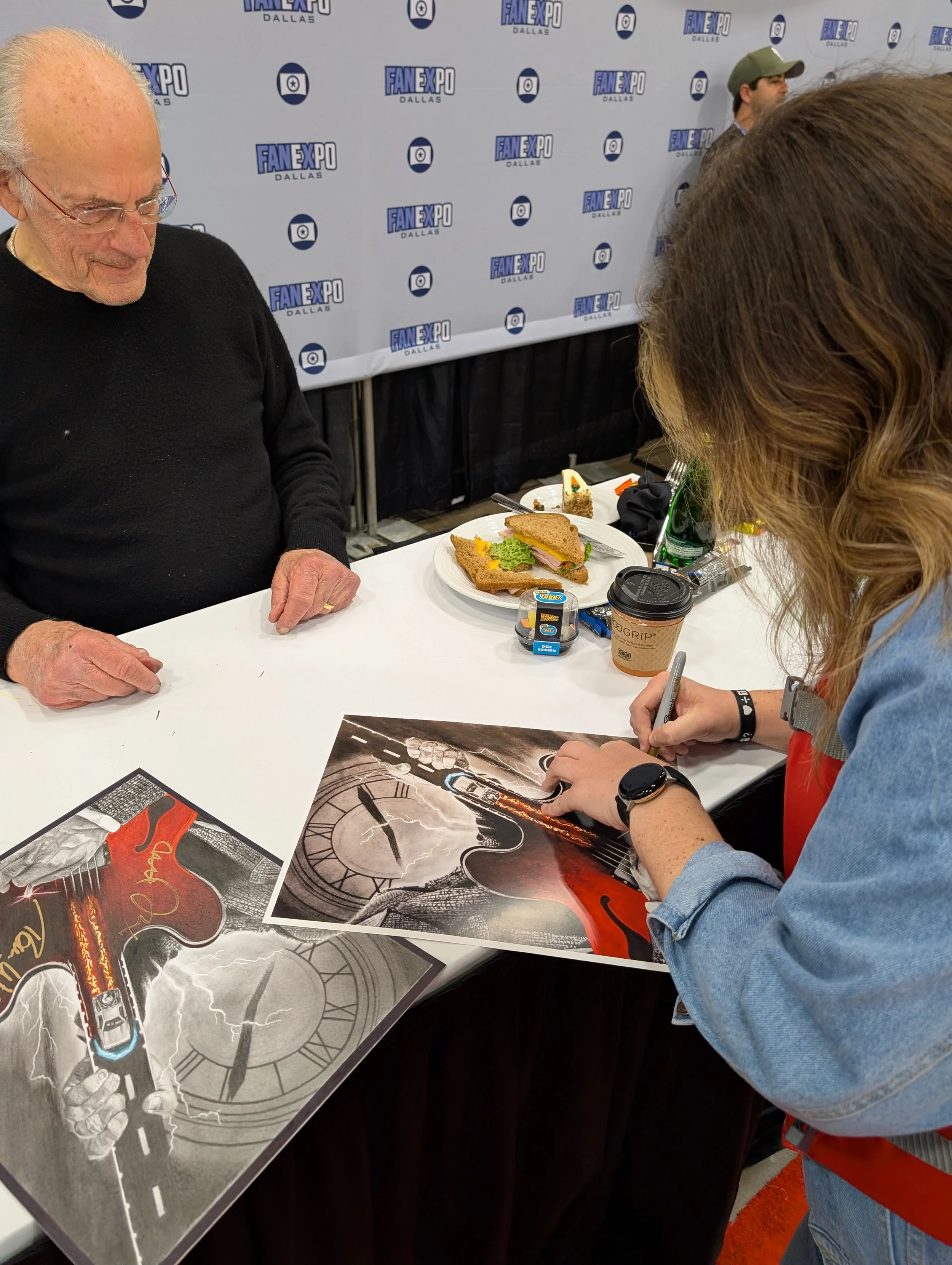 The highlight of the experience was my interaction with Christopher Lloyd, which I was fortunate enough to capture in photos. After the actors signed the original drawing, I would present them with their own prints of the piece. In an incredible turn of events, Christopher Lloyd and Frances Lee McCain were so impressed with the artwork that they insisted I sign the prints for them. Having a photo of myself signing my own work for "Doc Brown" himself remains one of the most surreal and rewarding milestones of my artistic career.